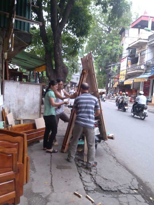 Vào vai một đôi vợ chồng sắp cưới đi mua giường và tủ, chúng tôi vào cửa hàng V.D (số 1084, đường La Thành) để chọn đồ. Người chủ hàng niềm nở giới thiệu cho chúng tôi nghe về các mặt hàng. Khi đã ưng ý với chiếc tủ 5 ngăn, chúng tôi thắc mắc làm thế nào để chuyển được món đồ cồng kềnh này về căn phòng trên tầng 5, người phụ nữ bán hàng trấn an bằng cách chỉ về người đàn ông có nước da ngăm đen đang đứng gần chiếc xe dream.