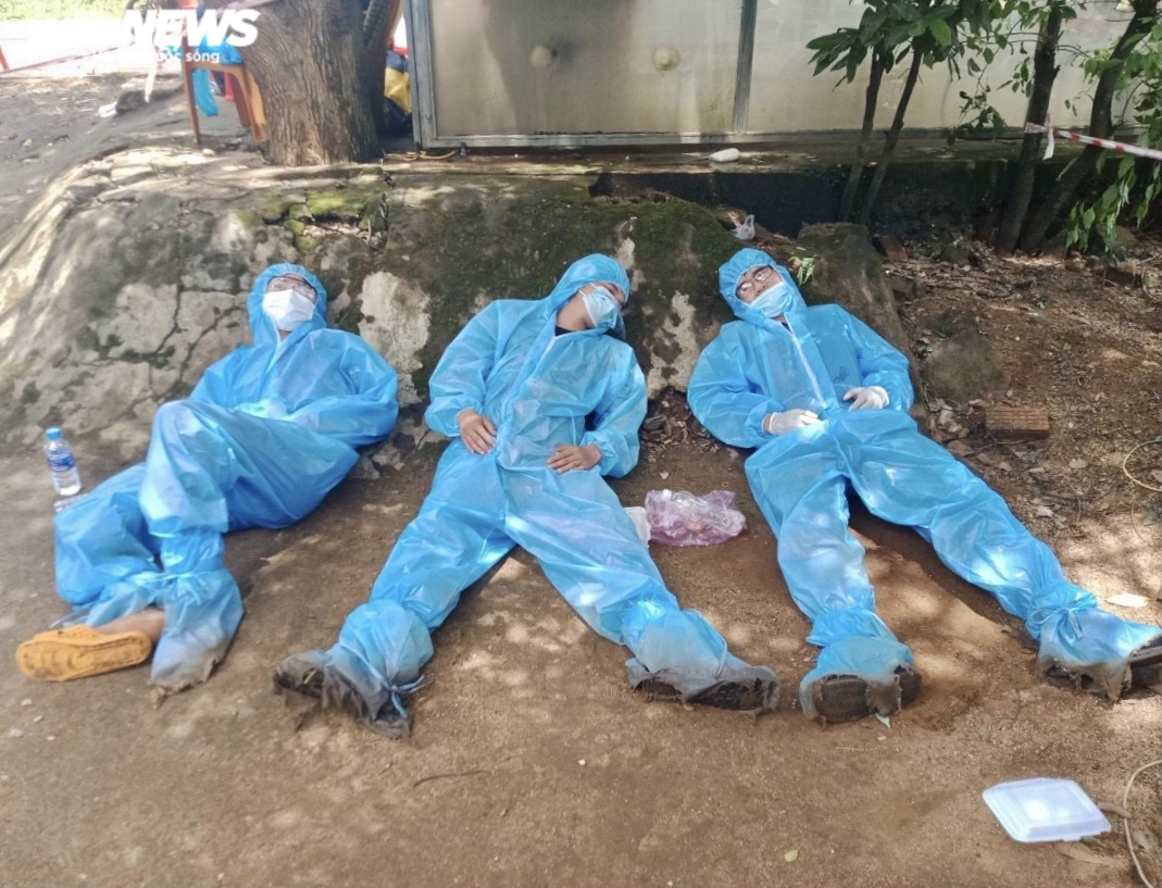 Trên người vẫn mặc nguyên bộ quần áo bảo hộ, các thành viên của nhóm tình nguyện tranh thủ chợp mắt ít phút sau một đêm phải căng mình chạy đua với công việc tại chốt kiểm dịch.