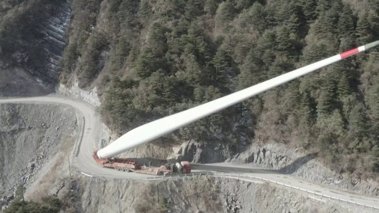 Đoạn video ghi lại cảnh các công nhân Trung Quốc điều hướng chiếc xe chở cánh turbine gió nặng 19 tấn di chuyển qua sườn núi ở Tứ Xuyên.