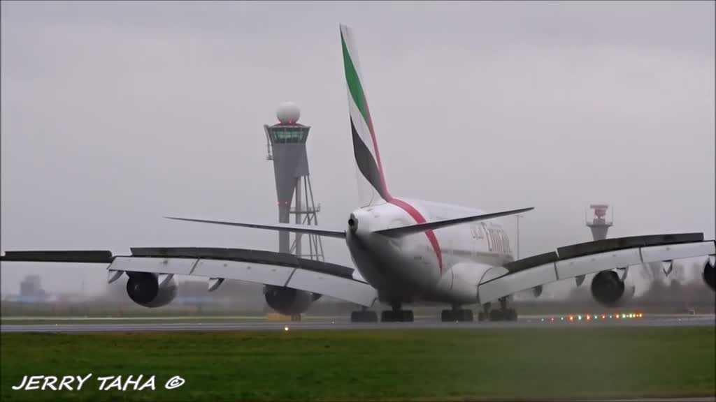 22/11/2016 16:10:00 +07:00Chiếc Airbus A380 - máy bay chở khách lớn nhất thế giới của hãng hàng không Emirates chao đảo dữ dội trong gió bão khi hạ cánh kiểu "con cua" (di chuyển ngang chiều gió) xuống sân bay Schiphol (Hà Lan).