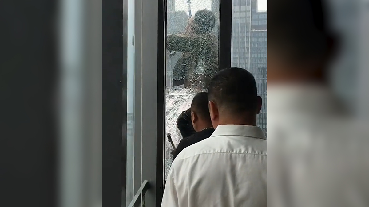 Các nhân viên văn phòng nhanh chóng đập vỡ cửa kính và giải cứu nam công nhân và mắc kẹt bên ngoài cửa sổ ở tầng 34 một tòa nhà tỉnh Sơn Đông, Trung Quốc.