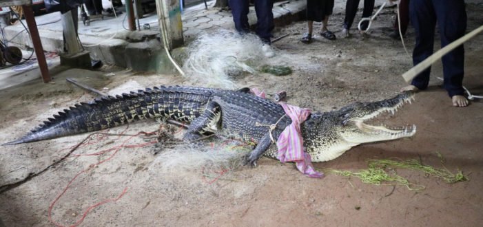 Rạng sáng 29/7, các thợ săn cá sấu tới từ tỉnh Surat Thani đã thành công lừa được con cá sấu sa vào lồng sắt khi nó đang ẩn náu ở bãi biển Layan, huyện Thalang, tỉnh Phuket.