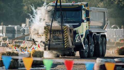 Đầu tiên là màn thử sức độ chịu va đập cực tốt của xe tải Volve FMX, một kiện hàng chứa gạch xi măng bên trong nặng tới 4 tấn được treo lên trên cao chỉ chờ khi chiếc xe tải Volve FMX lao tới. Một cú va đập “trời giáng” vào đầu chiếc xe tải, nhưng thật bất ngờ chiếc xe không hề gì.