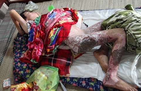 | Vết thương cháu Thành rất nặng, chưa có dấu hiệu lành nhưng gia đình đã đưa từ viện về |