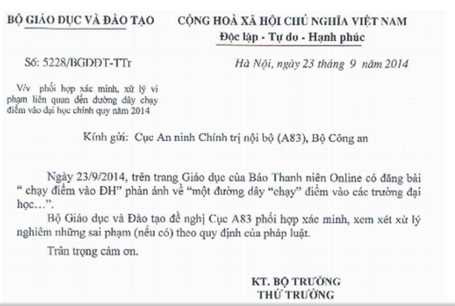 Nội dung công văn nêu rõ: "Ngày 23/9 trên trang Giáo dục của báo Thanh niên Online có đăng bài “Chạy điểm vào ĐH” phản ánh về “một đường dây chạy điểm vào các trường đại học...”.