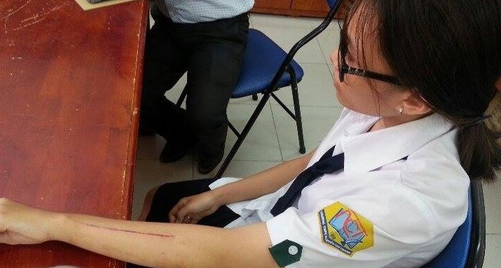 Trước đó, em nói với ba mẹ bị bạn dùng dao lam rạch vào tay do em sợ ba mẹ la với lại tức các bạn. Nhưng sau đó, em đã nói với gia đình là tự cứa tay vào cầu thang nhưng ba mẹ một mực không tin”.