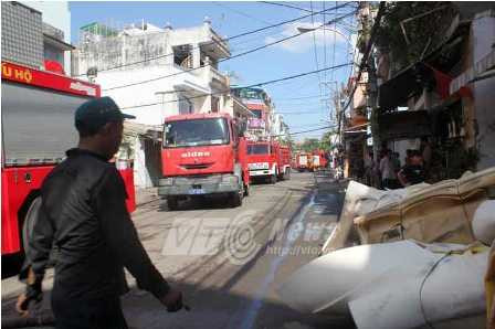 Do con hẻm quá nhỏ, công tác tiếp cận đám cháy gặp rất nhiều khó khăn, lực lượng chữa cháy phải luồn đường ống qua hẻm sâu mới tiếp cận hiện trường.