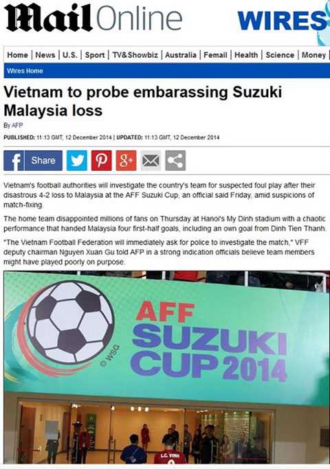 Thông tin này ngay lập tức thu hút sự quan tâm của các cơ quan truyền thông trên toàn thế giới. Hãng thông tấn AFP có bài viết với tiêu đề: “Việt Nam điều tra thất bại trước Malaysia tại AFF Cup”.