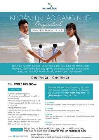 Đặc biệt, nhân dịp mừng Sunrise Hội An tròn 3 tuổi, khi đặt gói khuyến mại, du khách có cơ hội tham gia chương trình “Bốc thăm may mắn” với nhiều giải thưởng hấp dẫn bao gồm 02 đêm nghỉ tại biệt thự Sunrise sang trọng với bể bơi riêng dành cho 04 người lớn và 04 trẻ em hay 02 đêm nghỉ tại phòng Deluxe hướng biển, bao gồm ăn sáng.