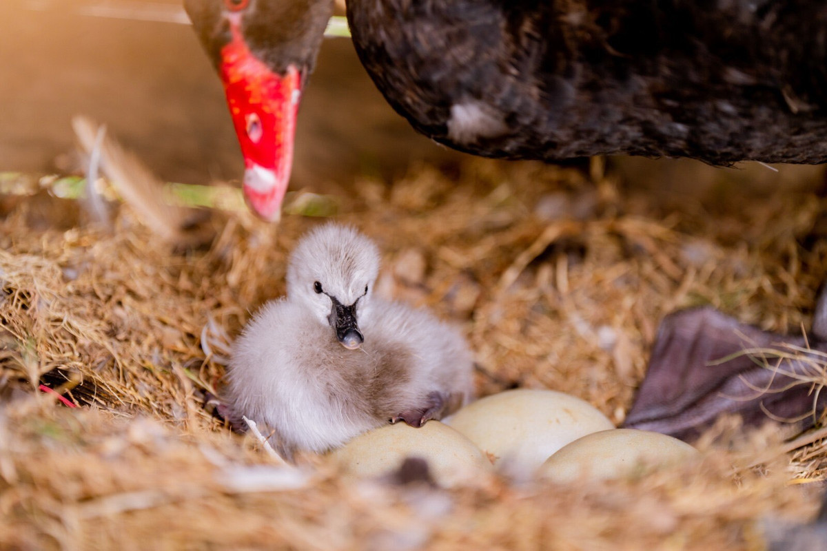 Sáng 23/8, tin vui gửi đến. Sau hơn một tháng ấp ủ, thiên nga nhỏ đã phá vỡ lớp vỏ cứng chui đầu ra ngoài. Khác với bộ lông cứng cáp của thiên nga mẹ, chú sở hữu bộ lông mảnh nhỏ óng mượt, êm nhẹ như tơ. Sau đó ngày 24/8-26/8, lại thêm 3 thiên nga con mổ vỏ cứng ra ngoài.