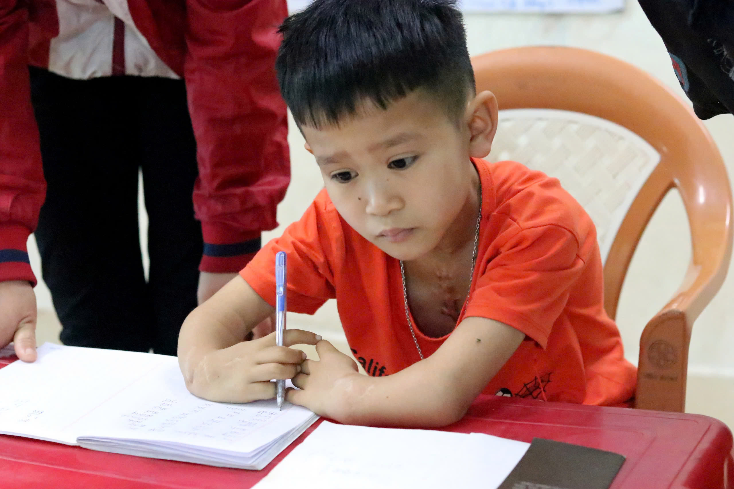 Dù chưa thể nhanh bằng bạn bè nhưng hiện Quang có thể viết chữ thành thạo, nét chữ tương đối đẹp.
