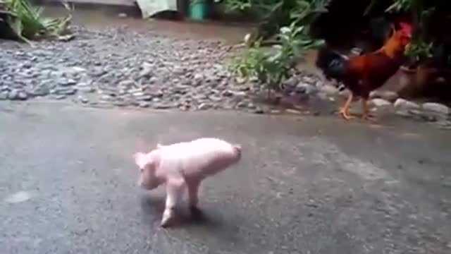 Dù sinh ra chỉ có 2 chân trước, chú lợn con vẫn quyết tâm tập giữ thăng bằng với mũi và 2 chân trước, những bước đi của chú khá chắc chắn và đầy vui vẻ.