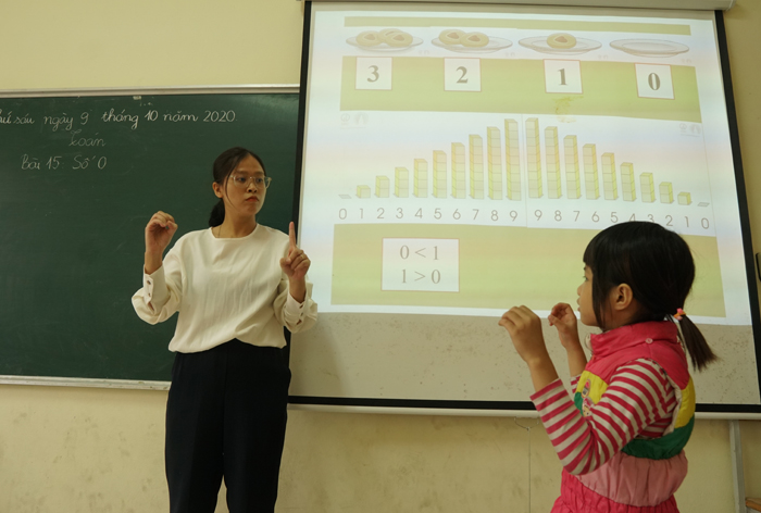 Cụ thể, khi giới thiệu Tiếng Việt thì phải có những hình ảnh minh họa, và là những từ có nghĩa. Nếu giáo viên trình chiếu hình ảnh, thì cần cho trẻ học ký hiệu và sau đó là đánh vần chữ cái ngón tay Tiếng Việt. Đồng thời, các thầy cô cần cho trẻ tập làm quen với các chữ Tiếng Việt vì trẻ cần có sự giao tiếp, thảo luận nhóm trong lớp với bạn bè, và mọi người xung quanh.