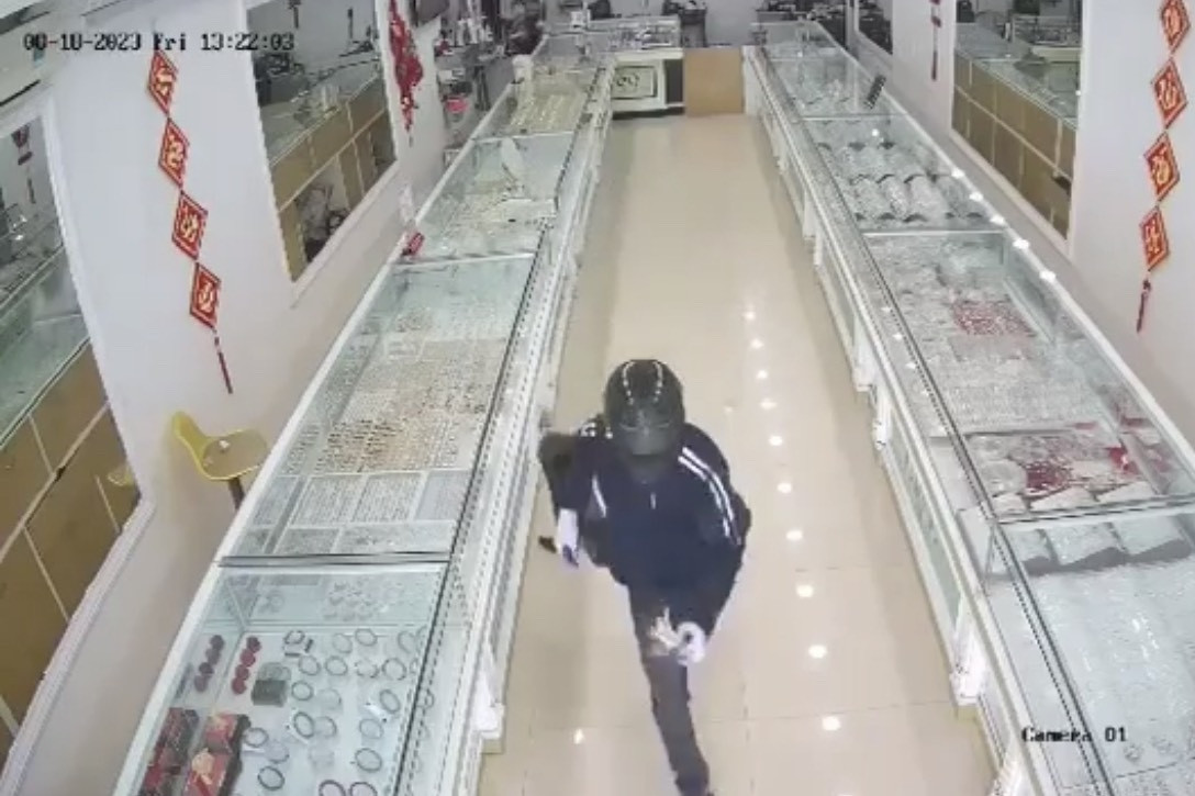 Ảnh chụp màn hình video ghi cảnh Lê Duy Anh Quân cướp tiệm vàng.