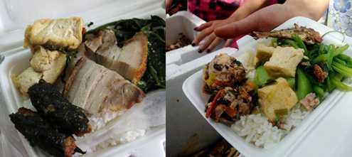 | Hộp cơm 25.000 đồng ở căng tin Bệnh viện Nhi Trung ương và cơm 5.000 đồng (phải) của Trung. |