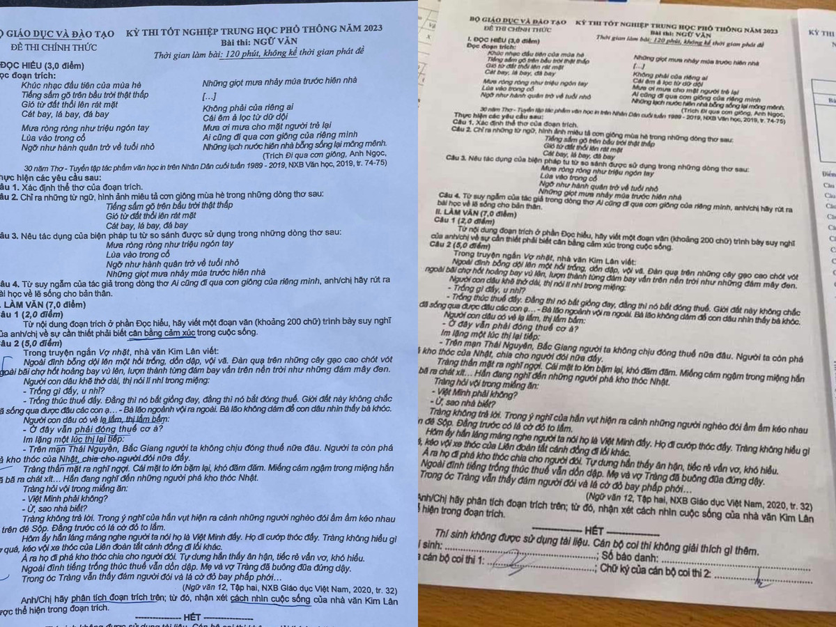 Đề môn Ngữ văn của Bộ GD&ĐT (trái) và đề lan truyền trên mạng (bên phải)