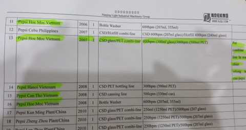 Cụ thể, theo tài liệu PV Báo Giao thông thu thập được thì Pepsi đã từng nhập dây chuyền máy móc của công ty lắp máy Nanjing (Trung Quốc). Máy móc nhập từ Trung Quốc được sử dụng ở các nhà máy của Pepsico tại Hà Nội, Cần Thơ, TP. HCM.