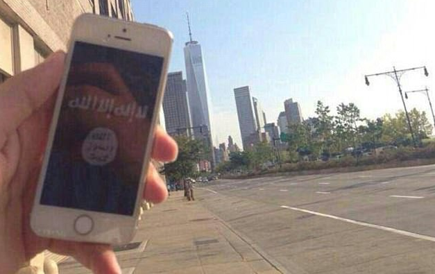 Trong ảnh, một người đứng ở cuối phố West, nơi có thể nhìn thẳng ra Trung tâm Thương mại Thế giới với chiếc điện thoại có hình lá cờ của IS.