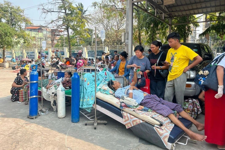 Người dân Myanmar bị thương do động đất phải nằm điều trị bên ngoài sân bệnh viện. (Ảnh: Getty)