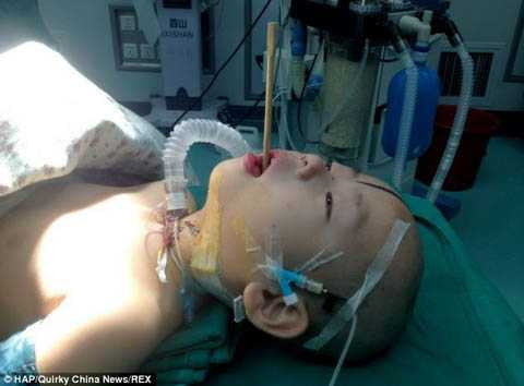 Cậu bé Li Kaiyi, 18 tháng tuổi người Trung Quốc vừa trải qua ca phẫu thuật khẩn cấp để lấy chiếc đũa ra khỏi miệng.
