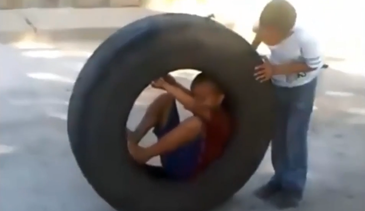 Cuộn mình trong lốp xe để đùa giỡn, cậu bé đã phải khóc thét, cầu sự giúp đỡ của bạn khi bị kẹt lại bên trong.