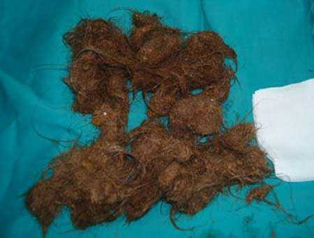 Theo lời kể của gia đình, cách đây một năm, bé bắt đầu có biểu hiện mệt mỏi, sút cân, kém ăn, hay nôn, chỉ ăn thức ăn loãng và uống sữa. Lần này được về Việt Nam chơi, cháu tiếp tục tái diễn tình trạng đau bụng và nôn thốc tháo khi ăn và được bà đưa tới bệnh viện Việt Đức khám. Qua thăm khám lâm sàng không thấy gì bất thường, nhưng khi tiến hành nội soi, các bác sĩ rất bất ngờ khi phát hiện có một khối tóc nằm trong dạ dày, khối tóc này còn kéo dài xuống tận tá tràng và vào ruột non của bệnh nhân.