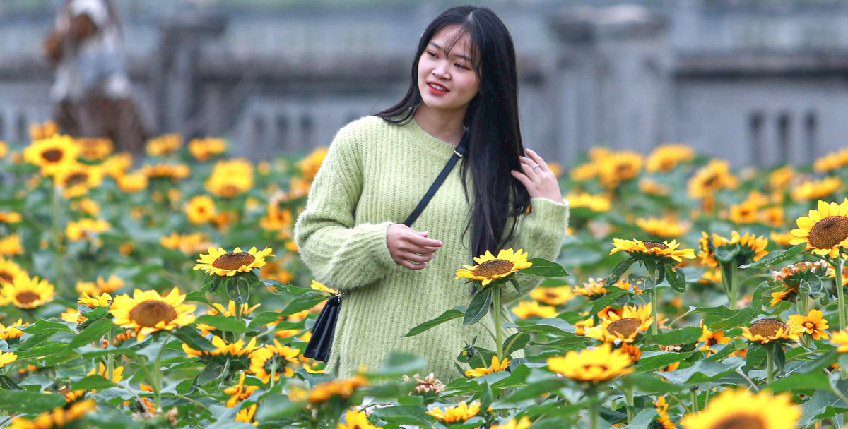 Các bạn trẻ tạo dáng bên vườn hoa hướng dương.