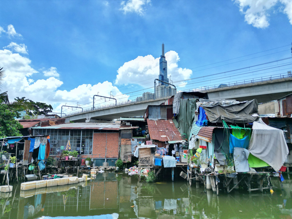 Cảnh đối lập những căn nhà xiêu vẹo, tạm bợ ven rạch nằm sát những công trình hiện đại, toà cao ốc.