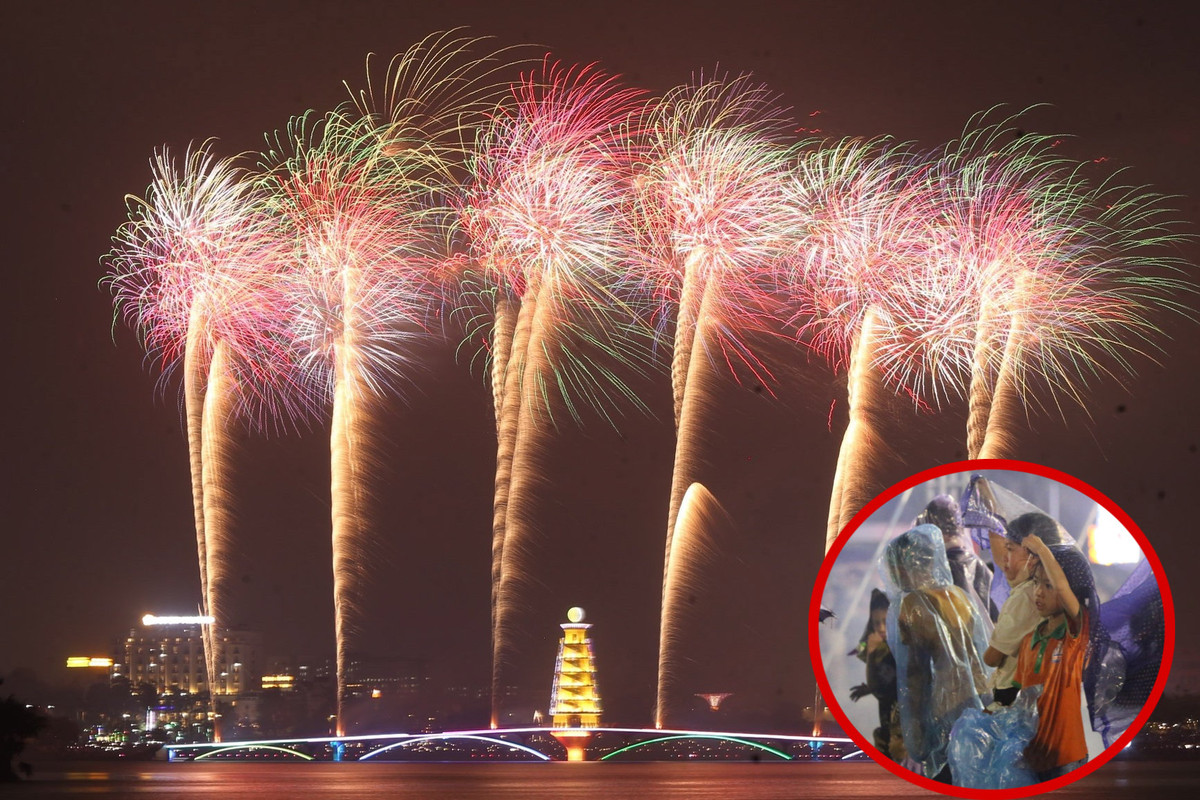 Tuy nhiên, sát giờ diễn ra chương trình, cơn mưa rào nặng hạt kèm sấm, chớp đổ xuống khiến nhiều người phải căng bạt, trèo lên vườn hoa ngồi chờ xem pháo hoa.