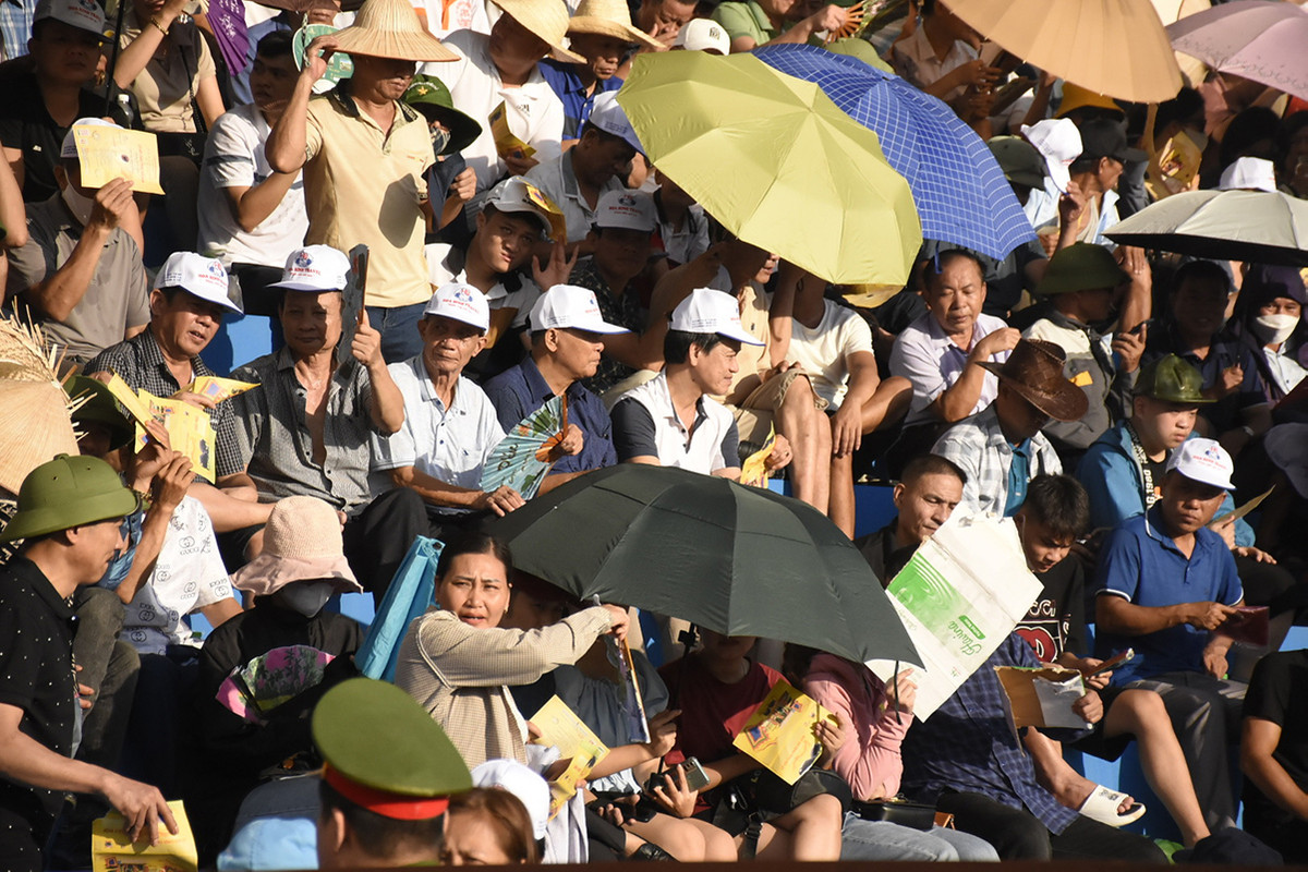 Từ 7h, thời tiết tại khu vực diễn ra Lễ hội chọi trâu đã rất nắng, mặc dù có mái che nhưng người dân vẫn phải dùng các thiết bị ô, mũ, giấy và liên tục quạt tay để giảm đi cái nắng nóng.