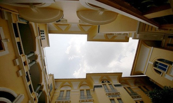 Tòa nhà đồ sộ cao 4 tầng, có bố cục đăng đối, gồm hai dãy nhà ngang và hai dãy nhà dọc khép kín tạo thành một giếng trời ở giữa. Ảnh: Zing.