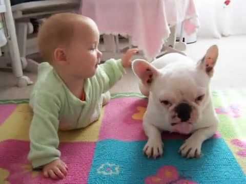 Ngộ nghĩnh clip chó bulldog dạy em bé tập trườn