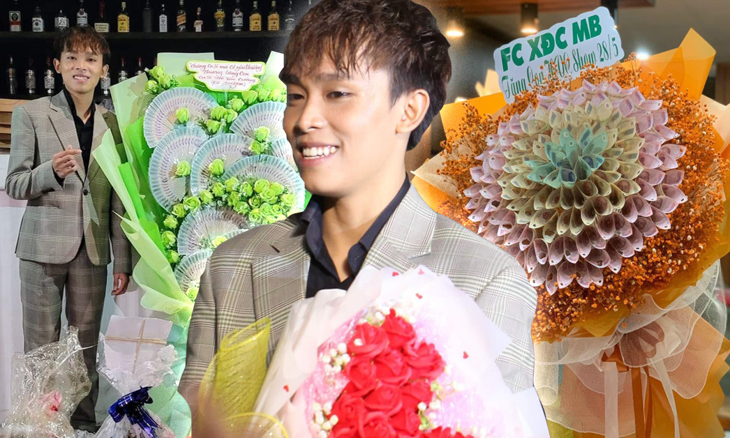 Hồ Văn Cường bên bó hoa với số tiền 120 triệu đồng.