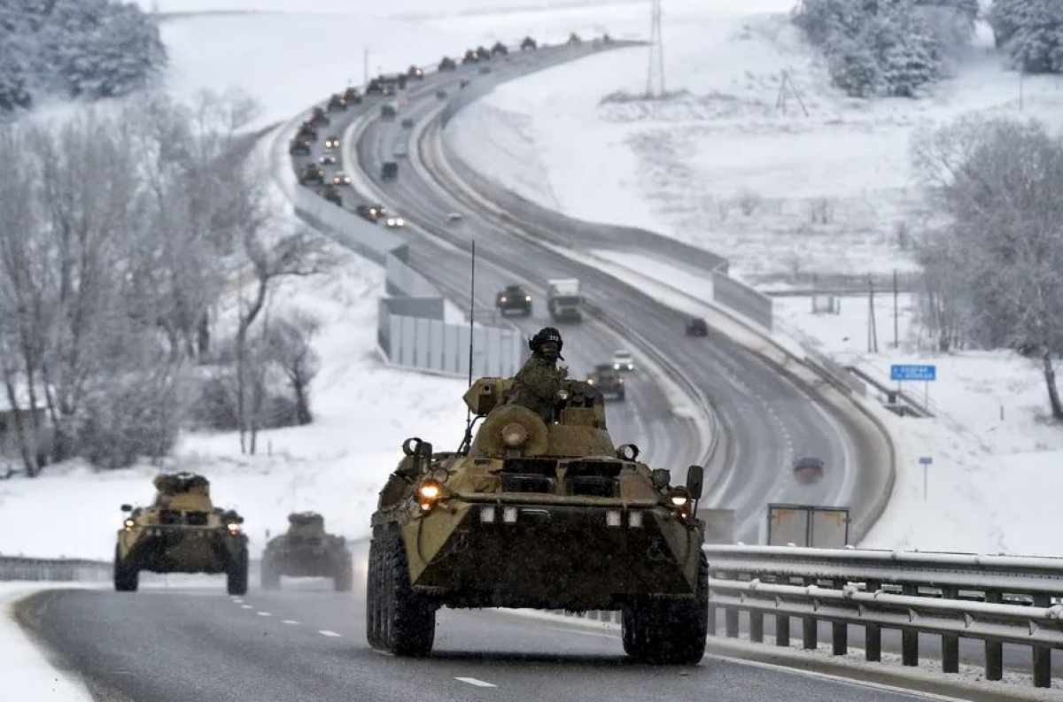 Các phương tiện bọc thép của Nga di chuyển trên một con đường cao tốc ở Crimea ngày 18/1. (Ảnh: AP)