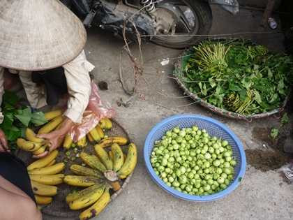 | Bà H đang bán cà, chuối tại chợ |