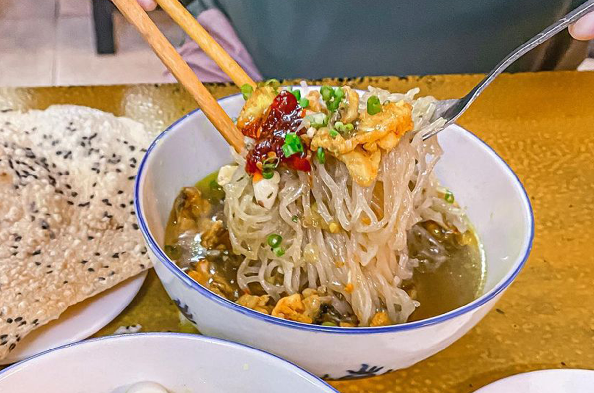 Những sợi phở có hình lưới, vị bùi bùi dai dai chính là điểm nhấn của món ăn. (Ảnh: heritagevna.magazine)