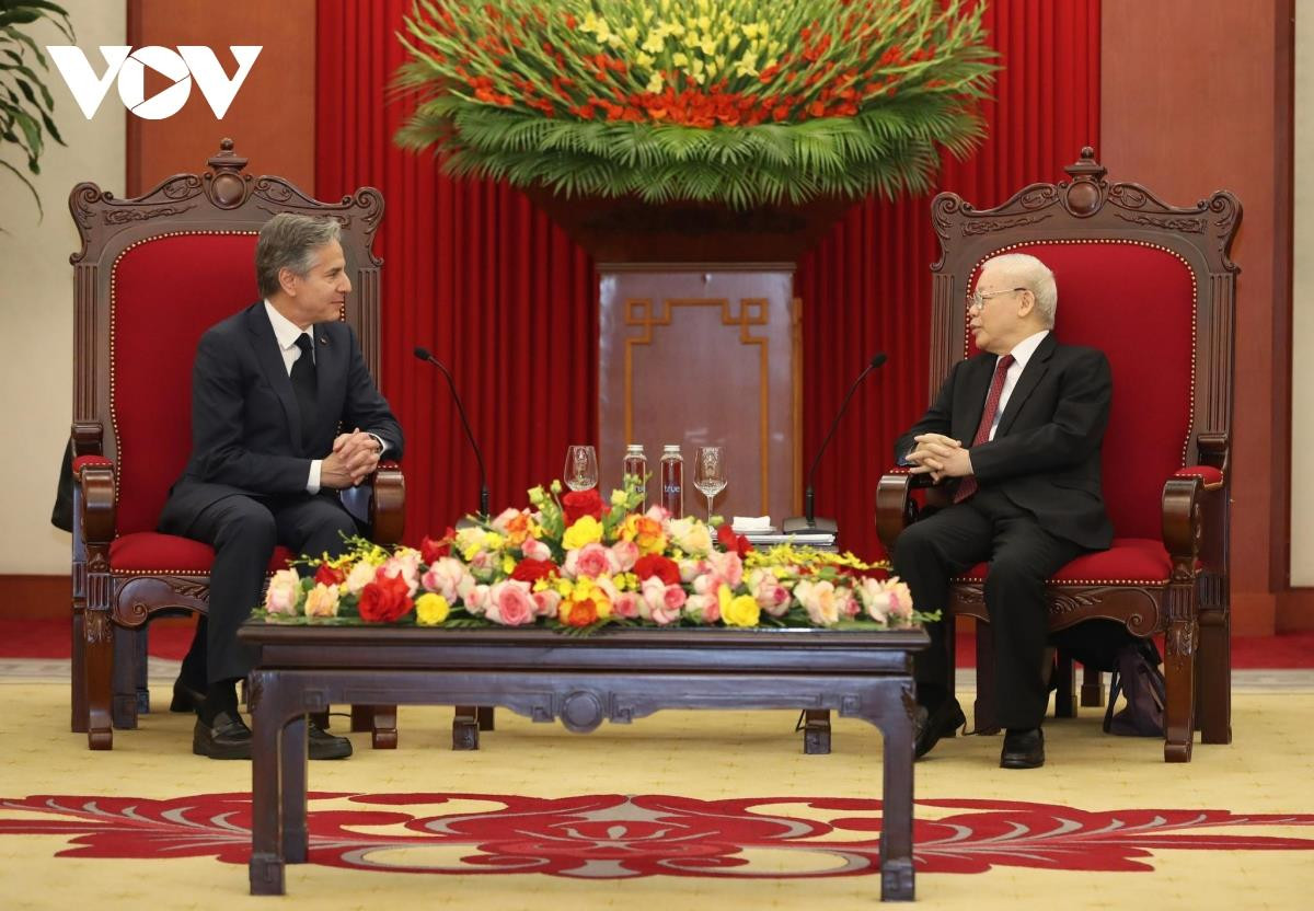 Ngoại trưởng Antony Blinken bày tỏ vinh dự và cảm ơn Tổng Bí thư đã dành thời gian tiếp Ngoại trưởng, chuyển lời thăm hỏi của Tổng thống Biden đến Tổng Bí thư Nguyễn Phú Trọng, chia sẻ Hoa Kỳ đánh giá cao thành công của cuộc điện đàm giữa hai nhà Lãnh đạo. Ngoại trưởng Blinken cũng chia sẻ đánh giá về sự phát triển toàn diện, thực chất của quan hệ Đối tác Toàn diện Việt Nam - Hoa Kỳ trong những năm qua, trao đổi nội dung của các cuộc làm việc trong chuyến thăm Việt Nam, nhấn mạnh cam kết của Hoa Kỳ tăng cường hợp tác với Việt Nam trong các lĩnh vực, nhất là thương mại - đầu tư, khoa học - công nghệ, giáo dục – đào tạo, ứng phó với biến đổi khí hậu. Ngoại trưởng Blinken nhấn mạnh cơ sở và các nguyên tắc trong quan hệ Việt Nam - Hoa Kỳ như Tổng Bí thư đã nêu và được khẳng định tại cuộc điện đàm, tái khẳng định Hoa Kỳ coi trọng quan hệ với Việt Nam, mong muốn đưa quan hệ lên tầm cao mới.