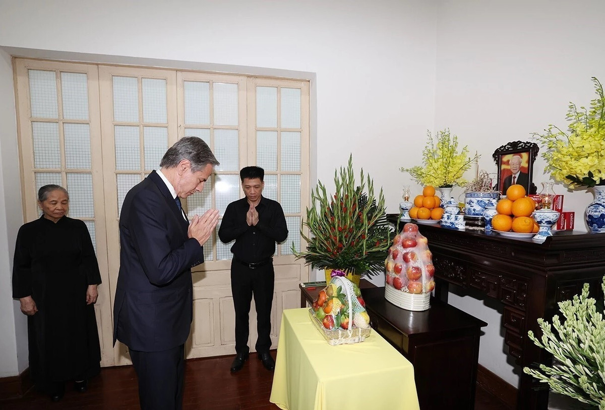 Theo thông tin từ Bộ Ngoại giao, tối 27/7, tại nhà Tổng Bí thư Nguyễn Phú Trọng tại phố Thiền Quang (Hà Nội), Ngoại trưởng Hoa Kỳ Antony Blinken cùng phái đoàn đại diện Tổng thống Hoa Kỳ Joe Biden đã đến thắp hương viếng Tổng Bí thư Nguyễn Phú Trọng và chia buồn với Phu nhân Ngô Thị Mận cùng gia quyến của Tổng Bí thư.