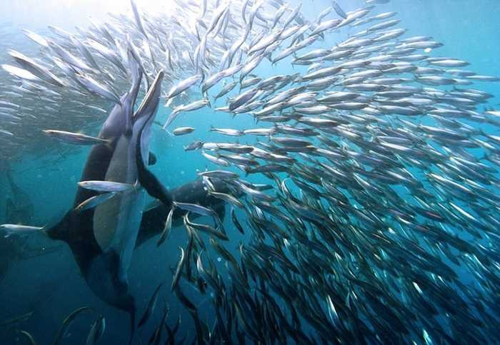 Những con cá mòi được cá heo, cá voi, cá mập vờn xung quanh. Trước sức mạnh và cơ thể lớn hơn của chúng, những con cá mòi sẽ vào miệng không quá khó