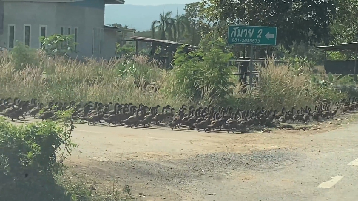 Đàn vịt hàng nghìn con tại Thái Lan lạch bạch băng qua đường như một đoàn tàu khiến nhiều người thích thú.