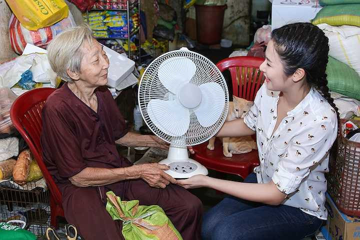Ngọc Hân cẩn thận lắp chiếc quạt nhỏ xinh thay thế cho chiếc quạt đã rất cũ ở nhà bà cụ.