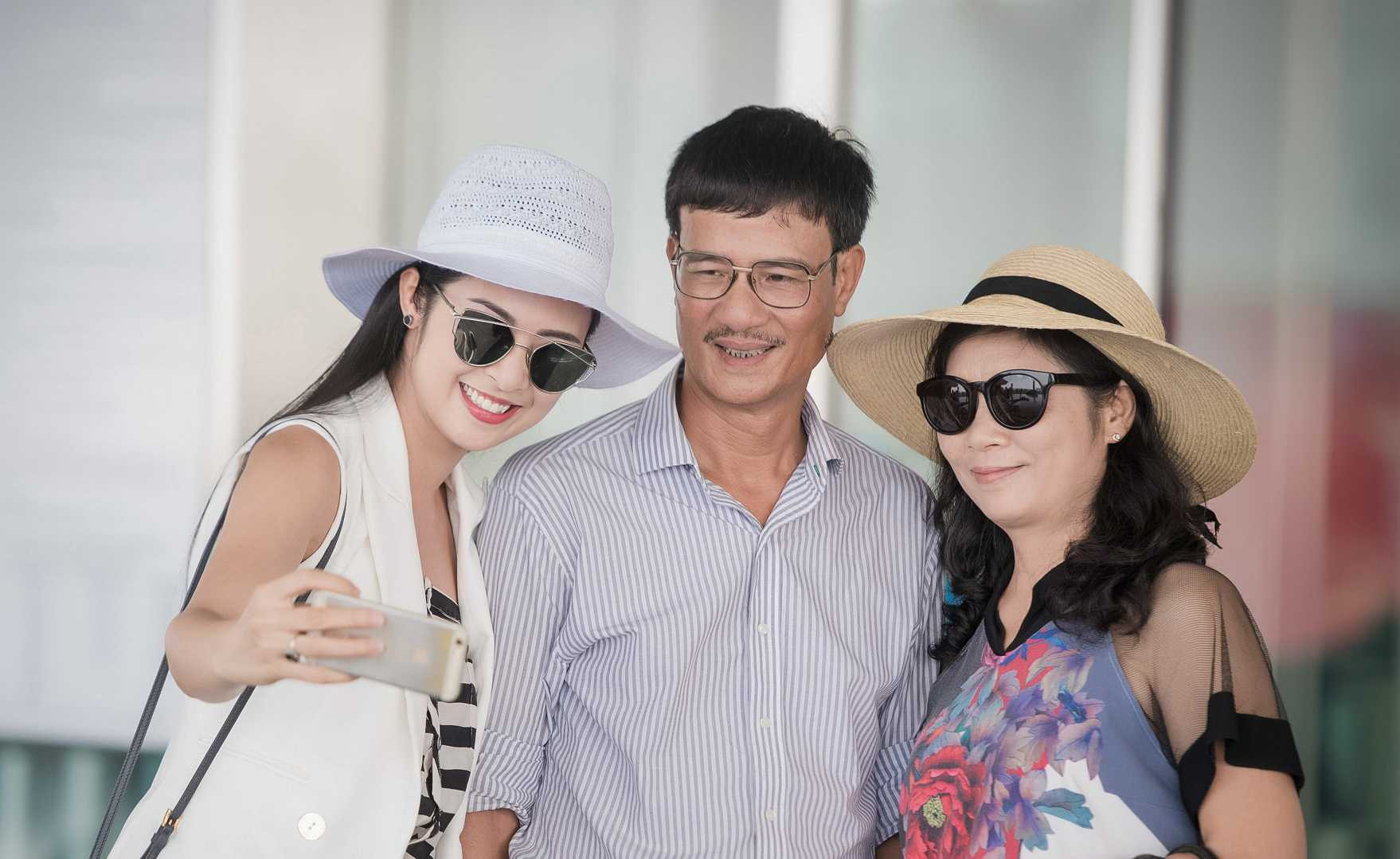 Không lộng lẫy như tại các sự kiện, khi xuất hiện ở sân bay, Ngọc Hân chọn style ăn mặc trẻ trung, mix cây trang phục đen - trắng cùng mũ rộng vàng và mắt kính sành điệu. Cô cũng chăm chút để bố mẹ luôn chỉn chu về ngoại hình mỗi lần đi nước ngoài với con gái.