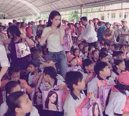 Điều đáng chú ý là trên các túi quà mà Ngọc Trinh tự tay tặng cho các em đều có in hình của cô. Trên mỗi chiếc túi, hình ảnh Ngọc Trinh khoe vai trần được in cỡ lớn.