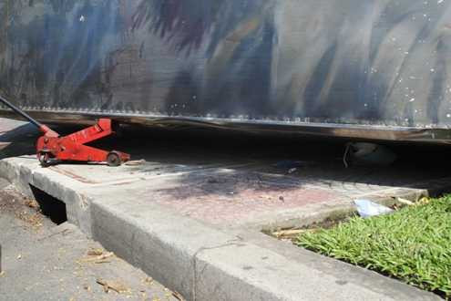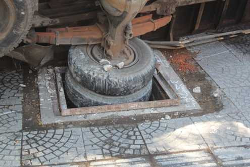 Không may, bánh sau bên trái của xe tải đè lên nắp hố ga làm nắp hố ga này bị sụt. Sự cố khiến thân xe tải bị chao đảo rồi lật ngang về phía bên trái.