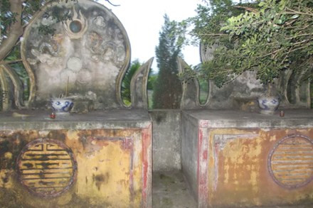 Dứt câu chuyện, trụ trì Thích Minh Thông dẫn chúng tôi đến hồi trái của ngôi đền, nơi duy nhất trong vùng còn dấu tích của nhị thập tứ tướng quận công. Hai ngôi vị được xây chắc chắn, song thời gian đã phủ lên nó một lớp rêu phong chứa đựng bao huyền tích.