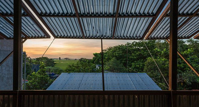 Phần mái nhà được đảo ngược từ hình dạng chữ A thông thường thành mái chữ V để mở rộng không gian nhà ra môi trường xung quanh.