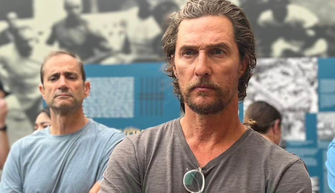 Matthew McConaughey nghiêm túc lắng nghe thuyết trình về di tích.