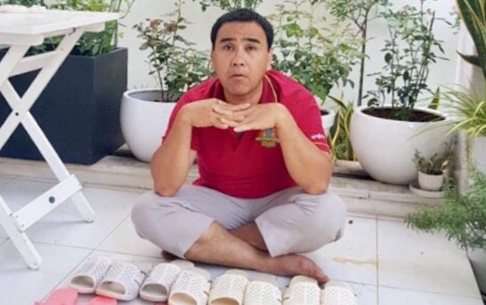 Quyền Linh tự hào khoe những đôi dép tổ ong đầy màu sắc mà anh sở hữu.