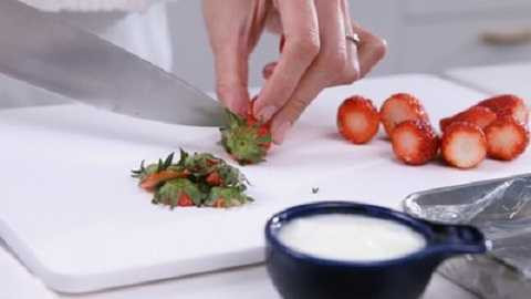 | Rửa sạch dâu tây rồi cắt bỏ cuống. |