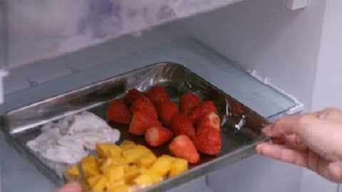 | Đặt dâu tây, xoài và cùi dừa vào một cái khay rồi cho vào tủ lạnh khoảng 1-2 giờ cho đến khi đông lạnh. |